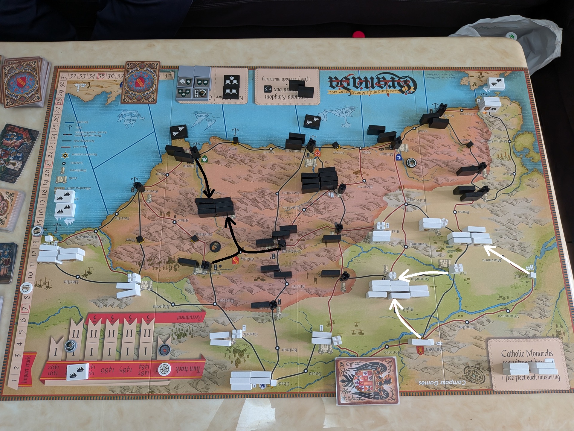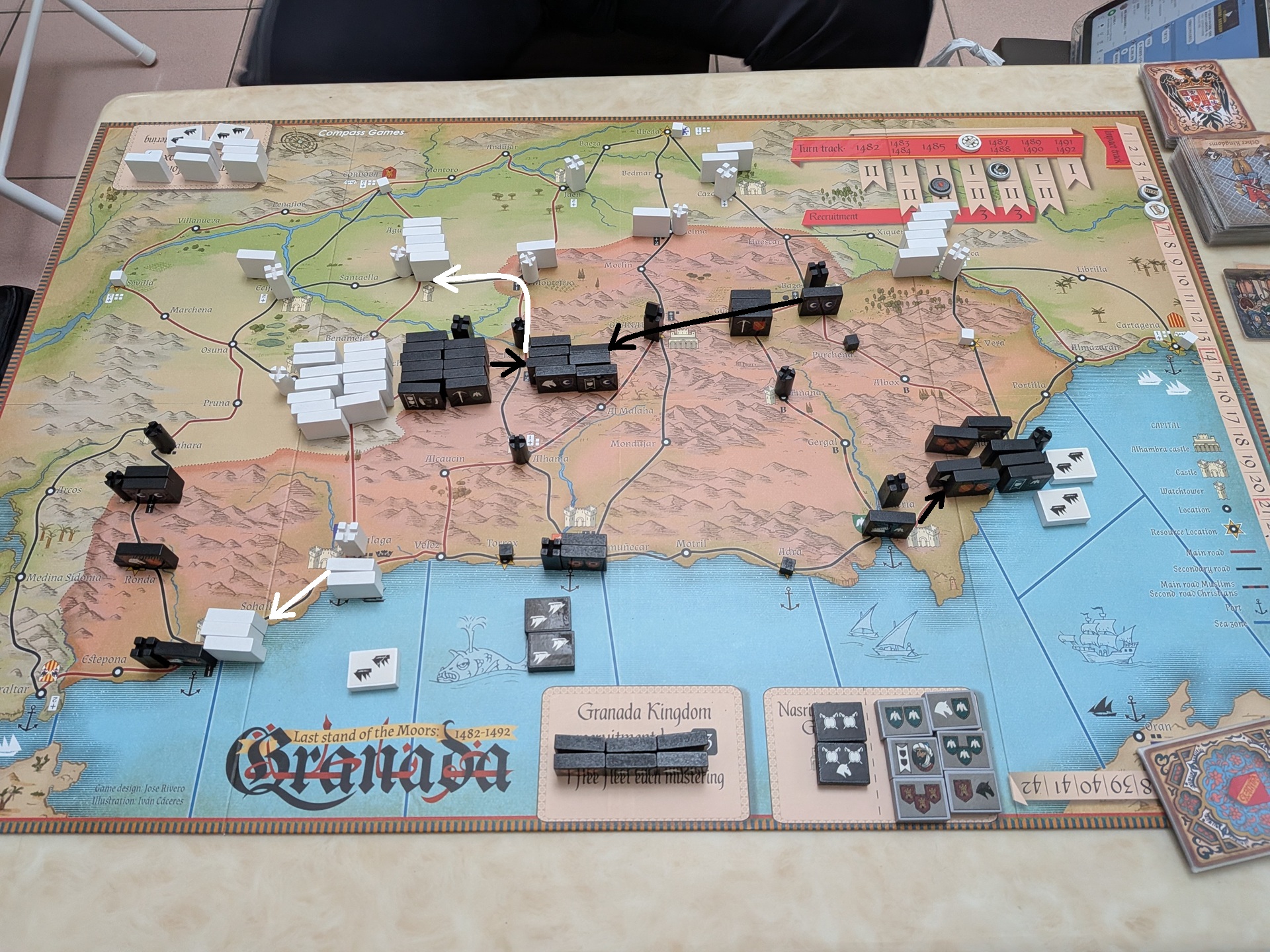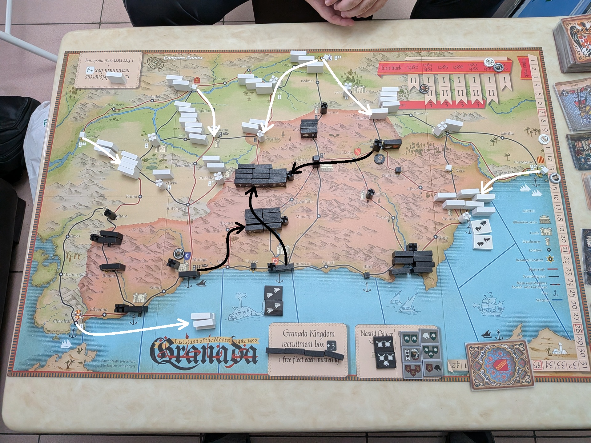 第一回合結束時的盤面。第一回合基督徒搶下先動,斐迪南合兵擊敗博阿迪,讓博阿迪變成基督徒操控。但穆斯林也趁第一回合雙方手牌都少,博阿迪部隊無法打出完整戰力的時間點,合兵消滅博阿迪、讓他重新回歸穆斯林操控。