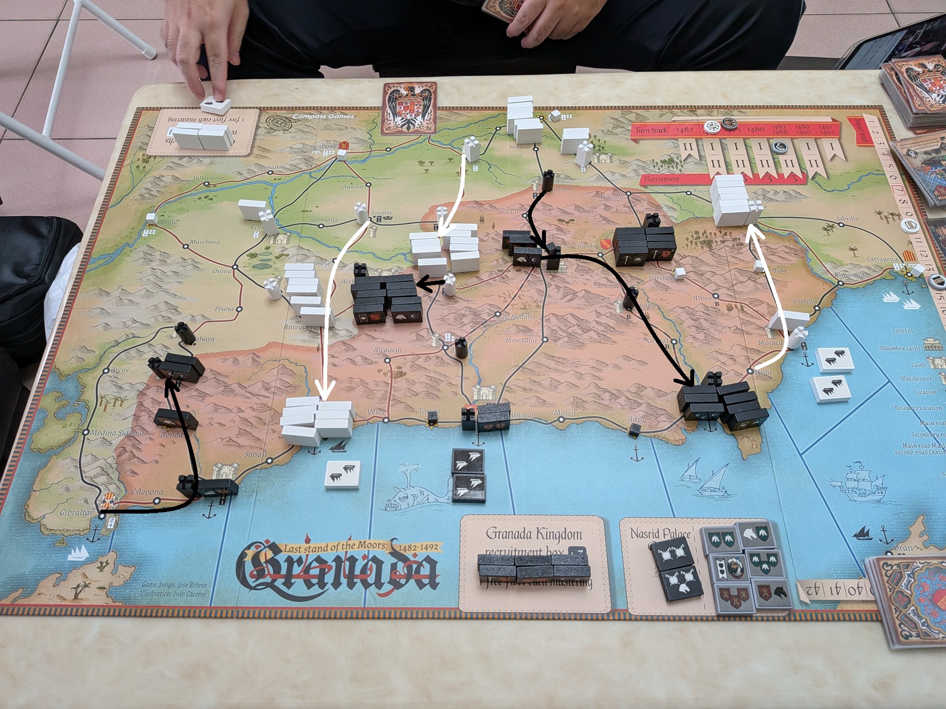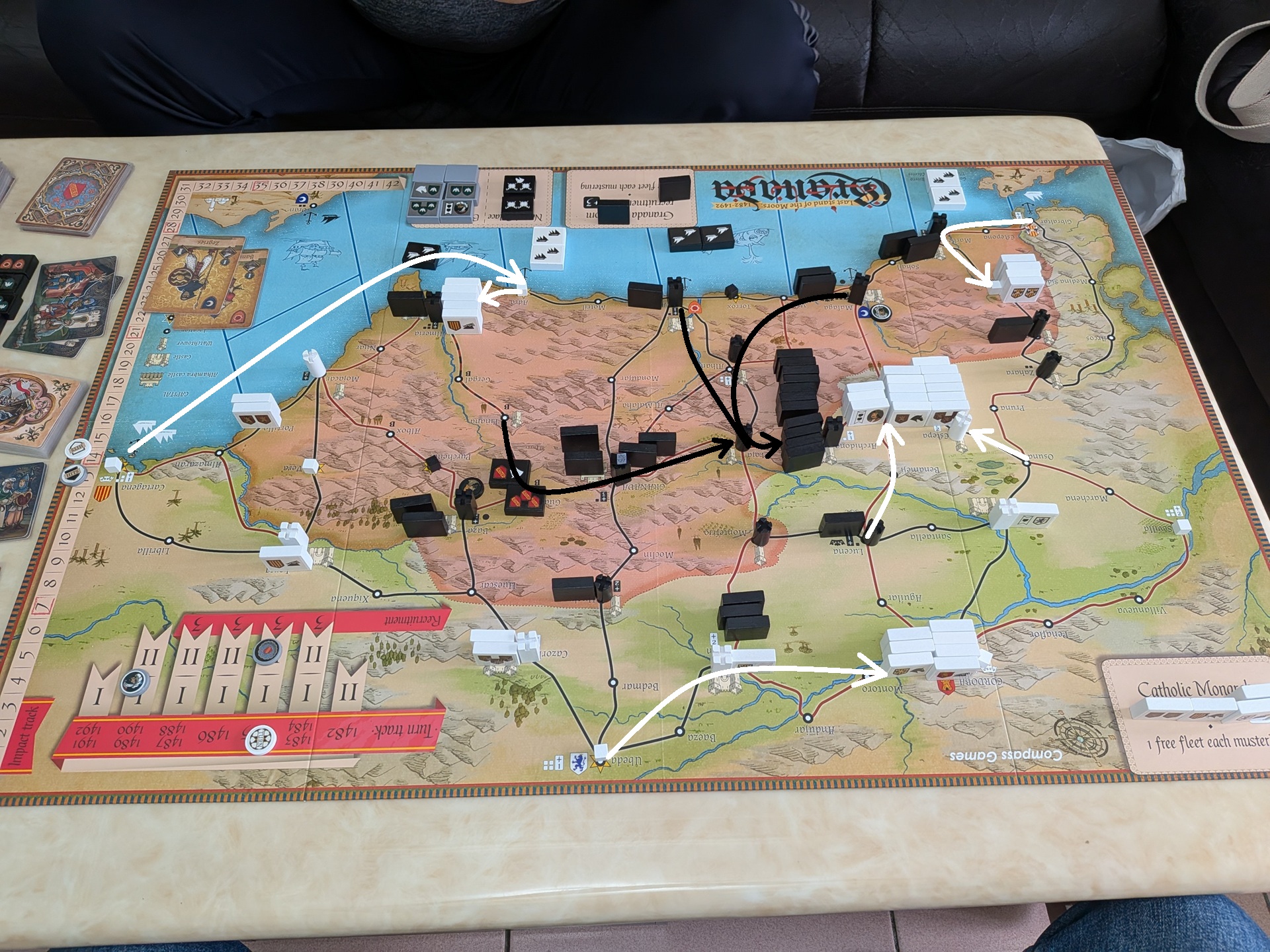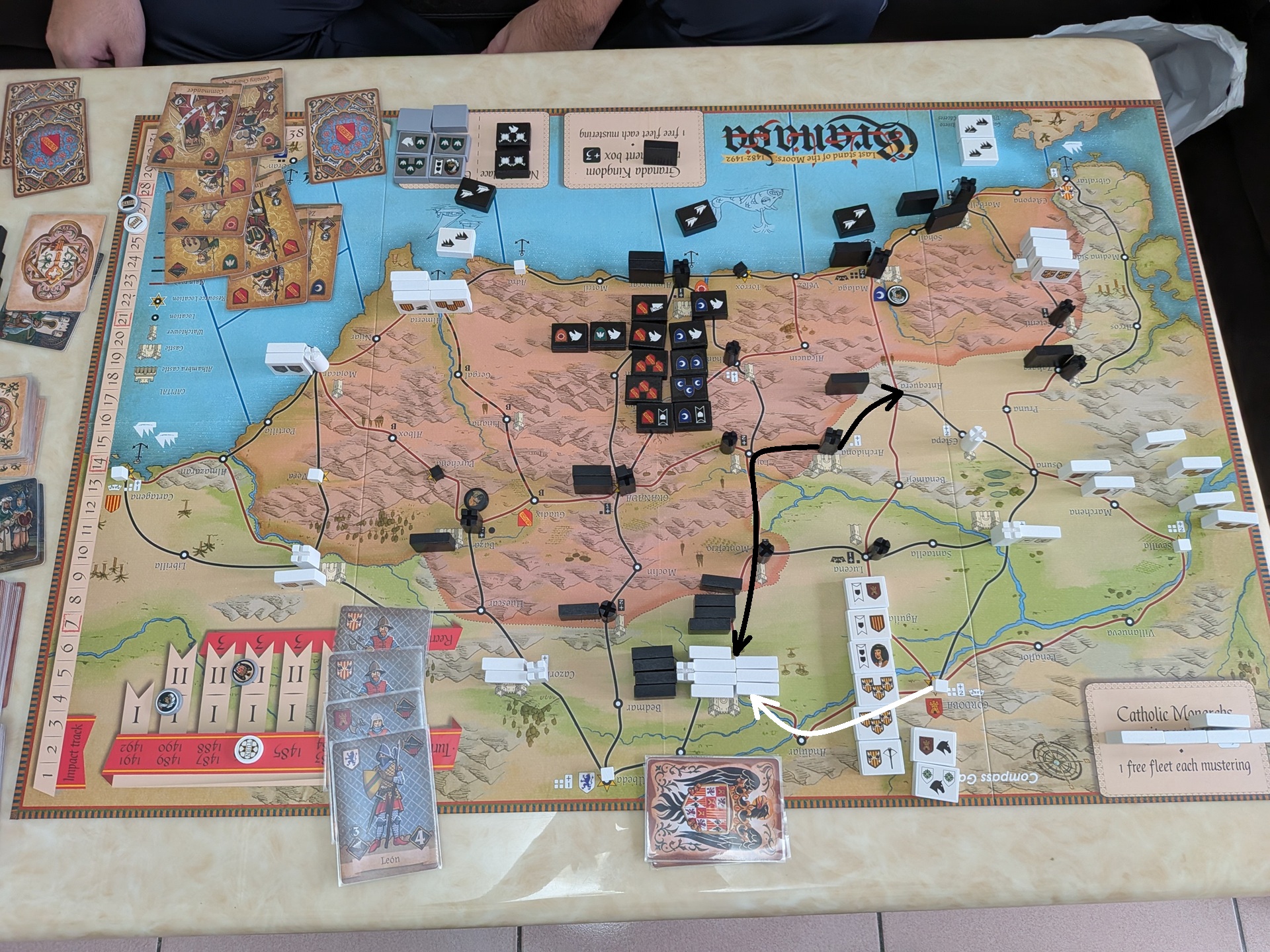 第一回合結束時的盤面。第一回合基督徒搶下先動,斐迪南合兵擊敗博阿迪,讓博阿迪變成基督徒操控。但穆斯林也趁第一回合雙方手牌都少,博阿迪部隊無法打出完整戰力的時間點,合兵消滅博阿迪、讓他重新回歸穆斯林操控。