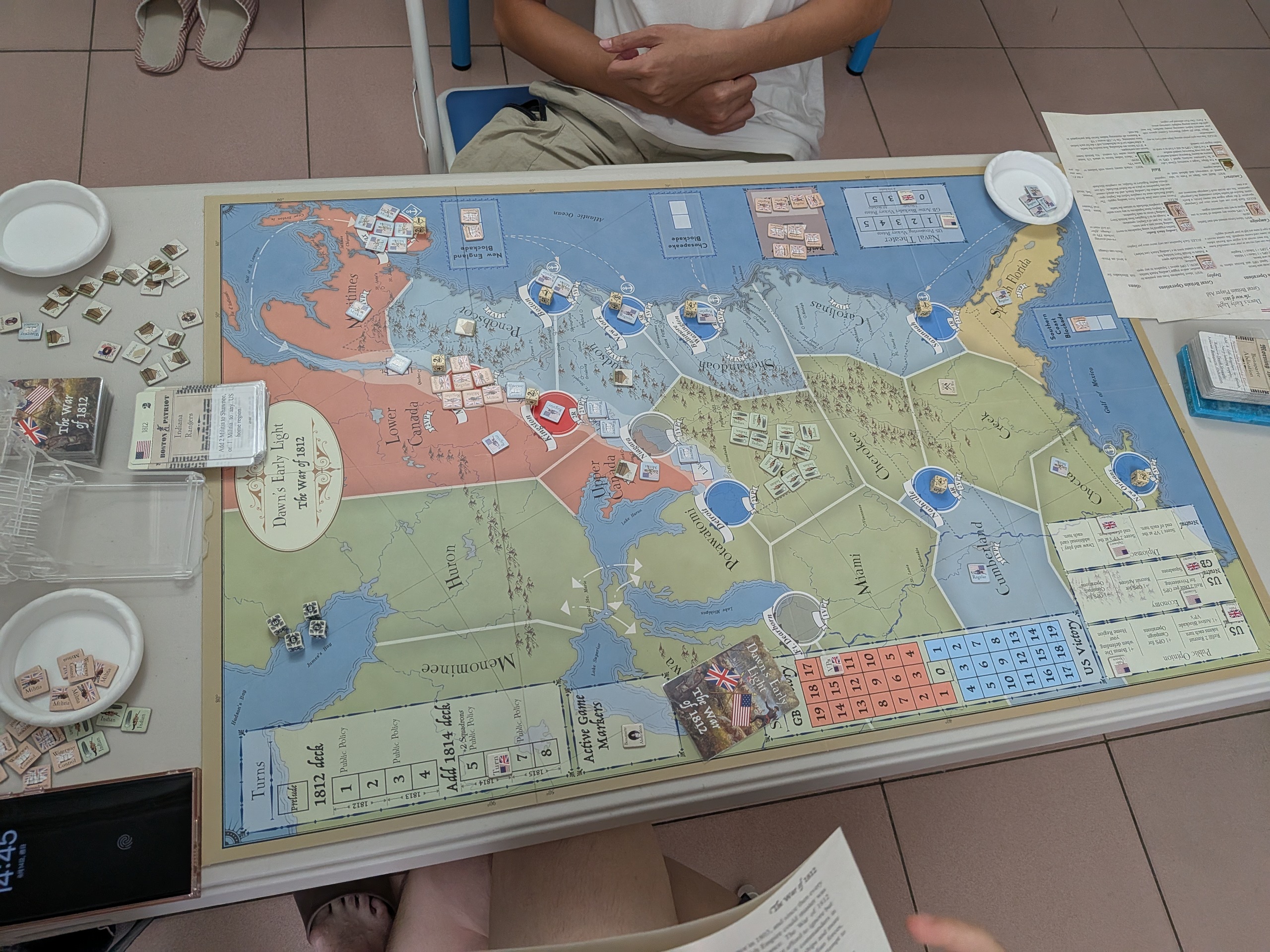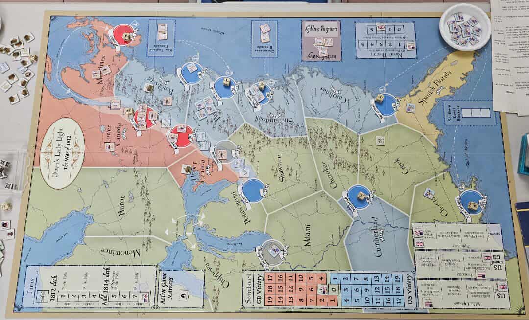 七月聚會另一位主揪 Fraser,開了追加 local rule調整平衡的 Dawn’s Early Light: The War of 1812,感覺很不錯,這個月就帶來訪新竹的山林再開這款遊戲。Fraser扮演英國,山林扮演美國。
