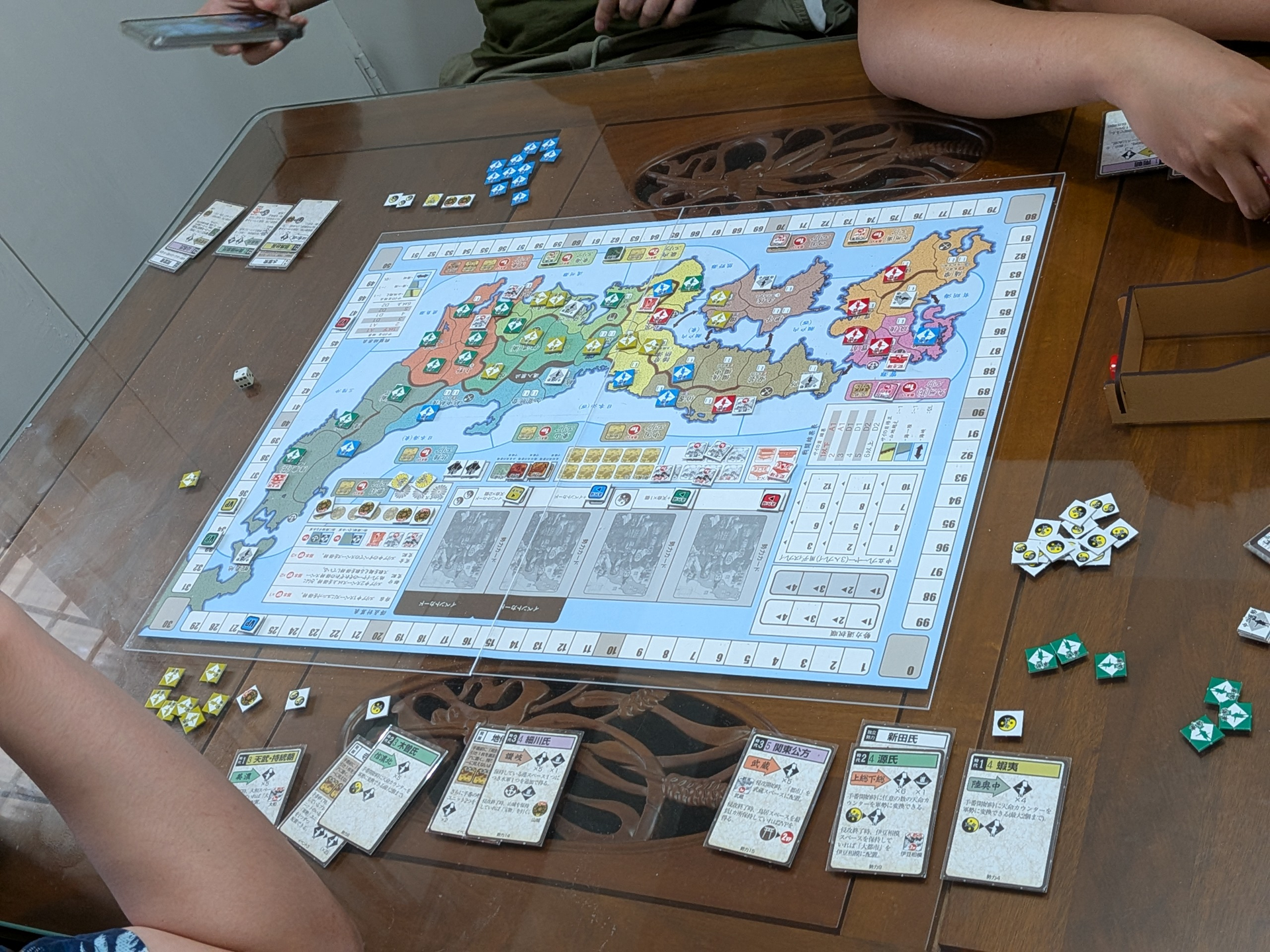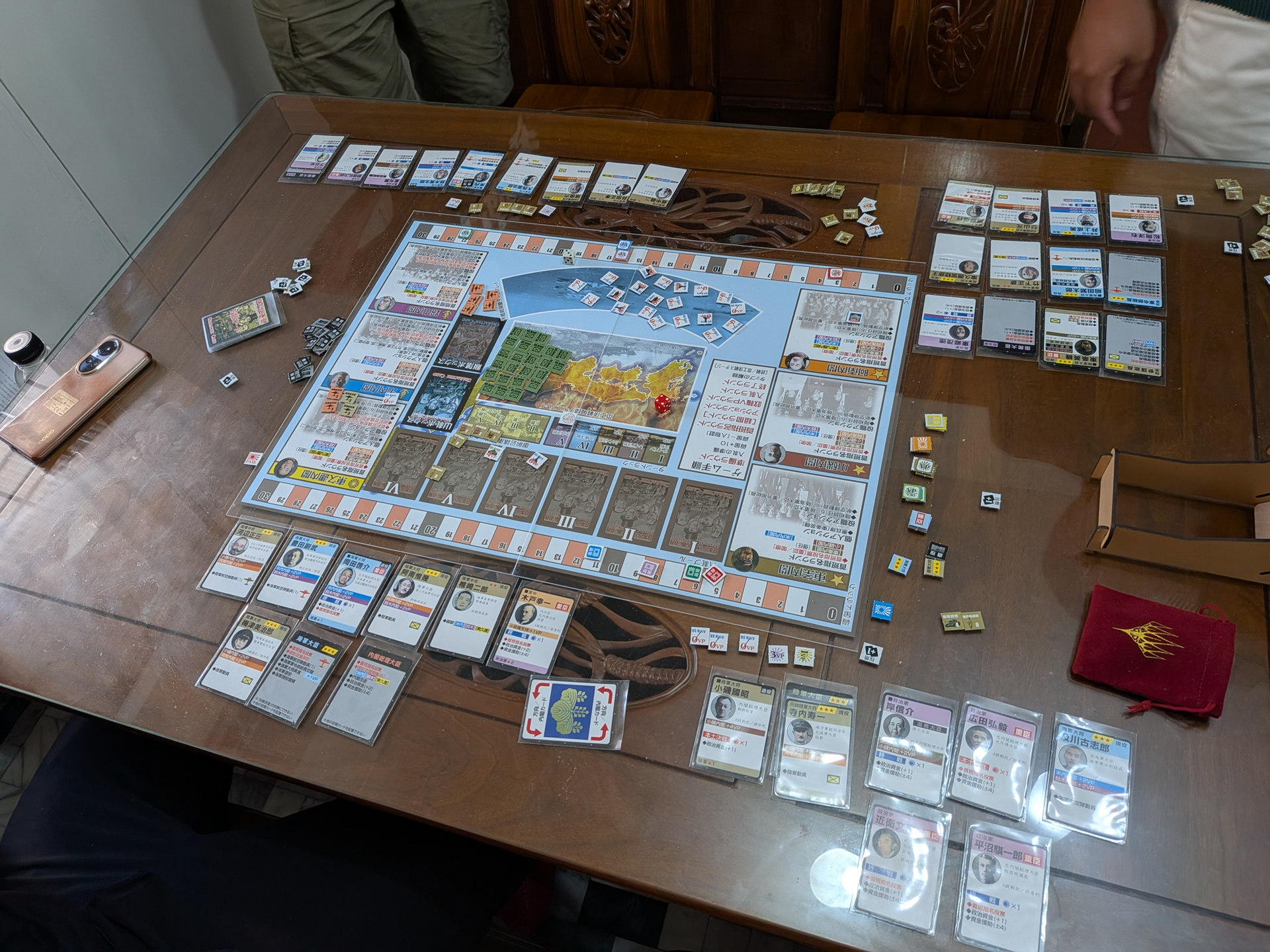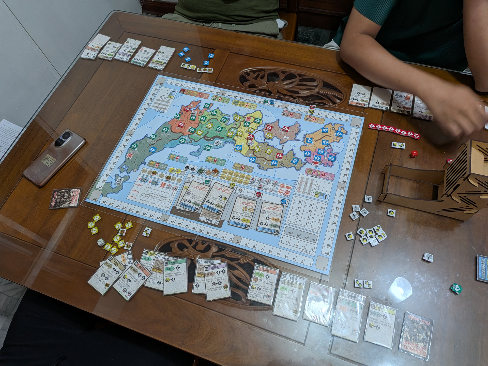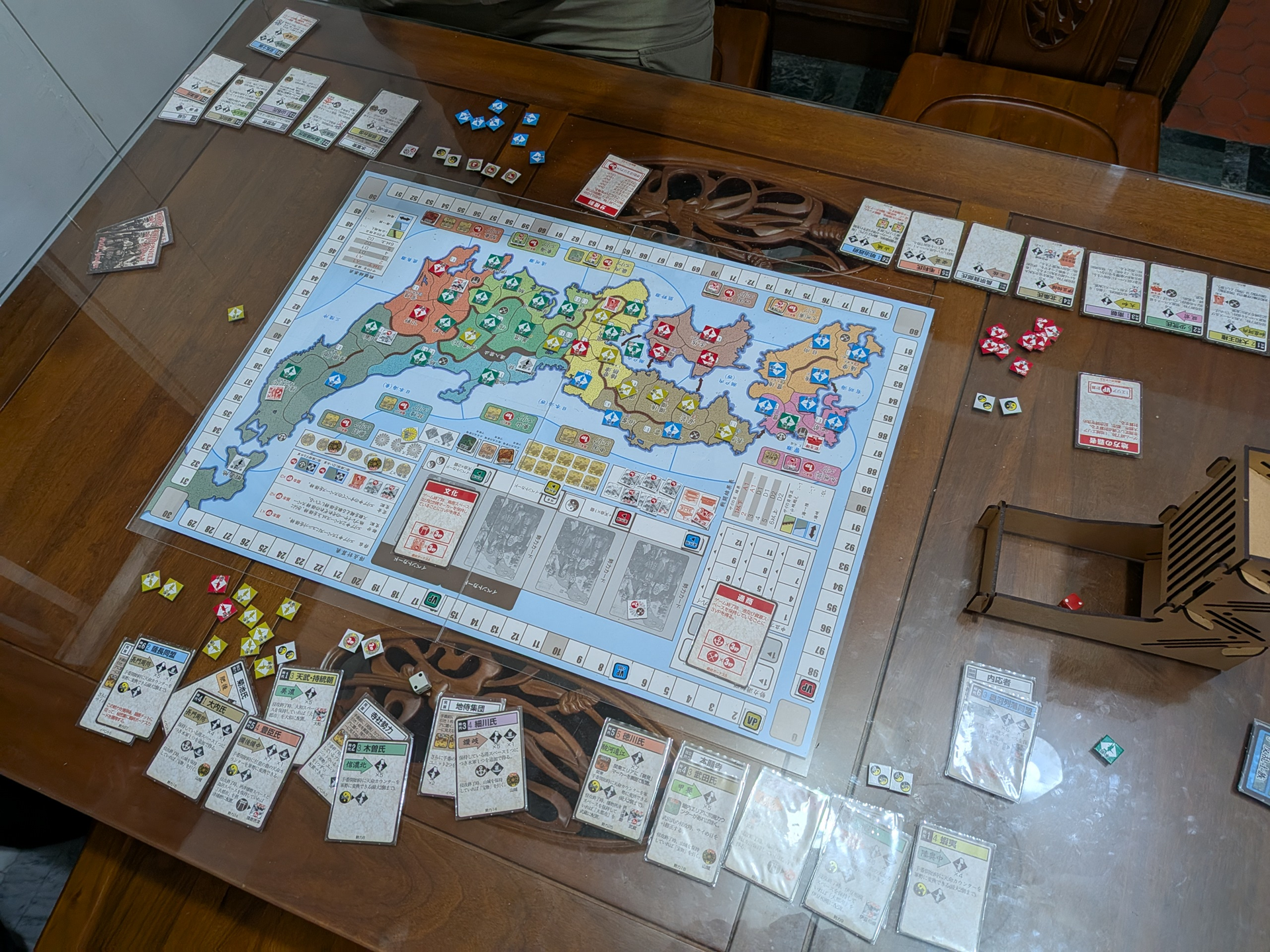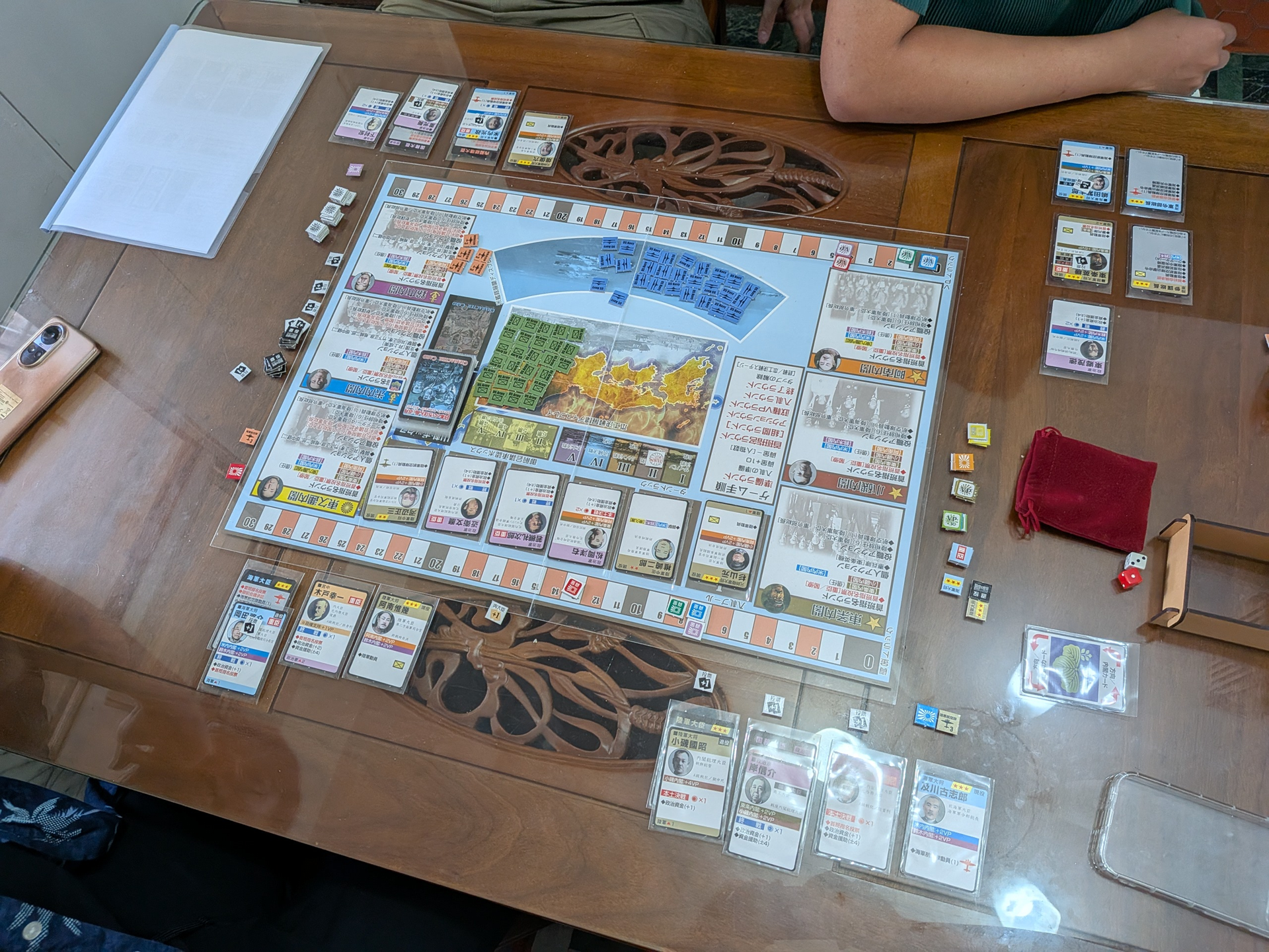 最長八月結束後還有一些時間,就開了日本編年史四人局,這款含教學兩到三小時就能結束的中小遊戲。有採用我的 local rule:每回合勢力選擇,由 VP低到高的玩家依序選擇。