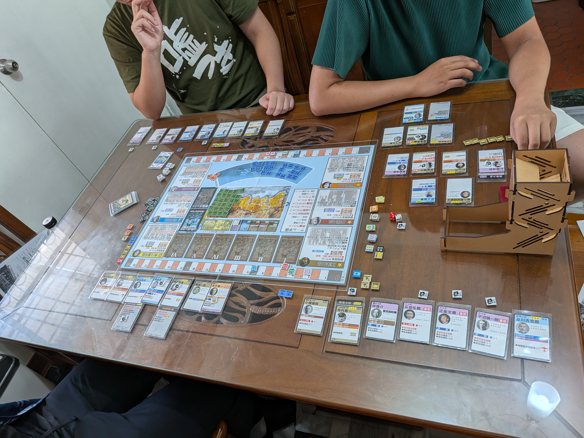前作的大革命,玩家之間幾乎是純競爭關係,其實沒有太多能協商的,頂多一起針對最領先的玩家先關再殺。但最長八月因為內閣總理大臣要分配官職,且很難像大革命的羅伯斯比/拿破崙之類,一人就投三票以上,直接讓政體決定沒有懸念。和其他玩家協商,提出別人能接受的利益交換方案,是這款遊戲的核心與特別之處。就算票最多的一位玩家,隨便結盟另一位玩家就能獲得過半票數組閣,票少的三位玩家也能協調出組閣方案與之抗衡,或者反向對票最多的玩家輸誠、讓自己擠入閣員名單。這場第三回合大家在討論組閣時,一度是「大家繼續支持米內組閣吧!」「不不讓米內組閣會OOO,何不讓小磯組閣?」「讓小磯組閣,那選東條也可以啊,我還可以XXX。」「別傻了讓東條組閣發動憲兵隊,還是支持米內吧!」……乍看之下在繞圈子,實際上協商的過程中大家一直腦力激盪、提出條件與分析利害。甚至投票到一半,如果優勢方覺得勝負已定、選擇 pass節省行動,還能投票的其餘玩家還可能協調出不同的組閣方案,推翻投票前的討論。這個體驗相當有意思,反而行動階段就比較平穩,不會有太多出乎意外的發展。但這個鼓勵大家說話的遊戲類型,相反的可能就較不適合不愛說話、默默規劃策略這型的玩家。