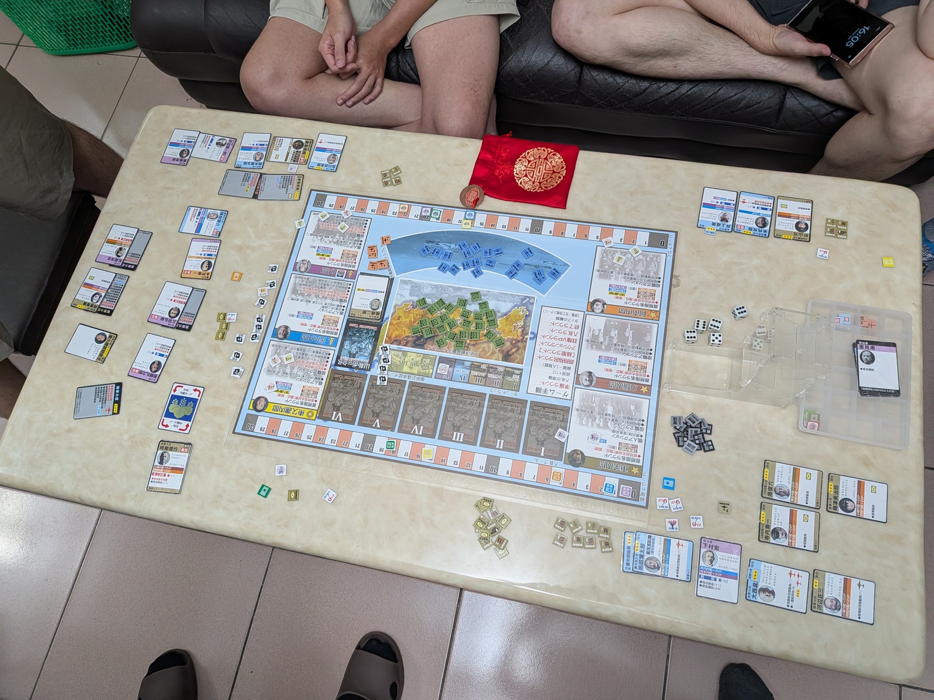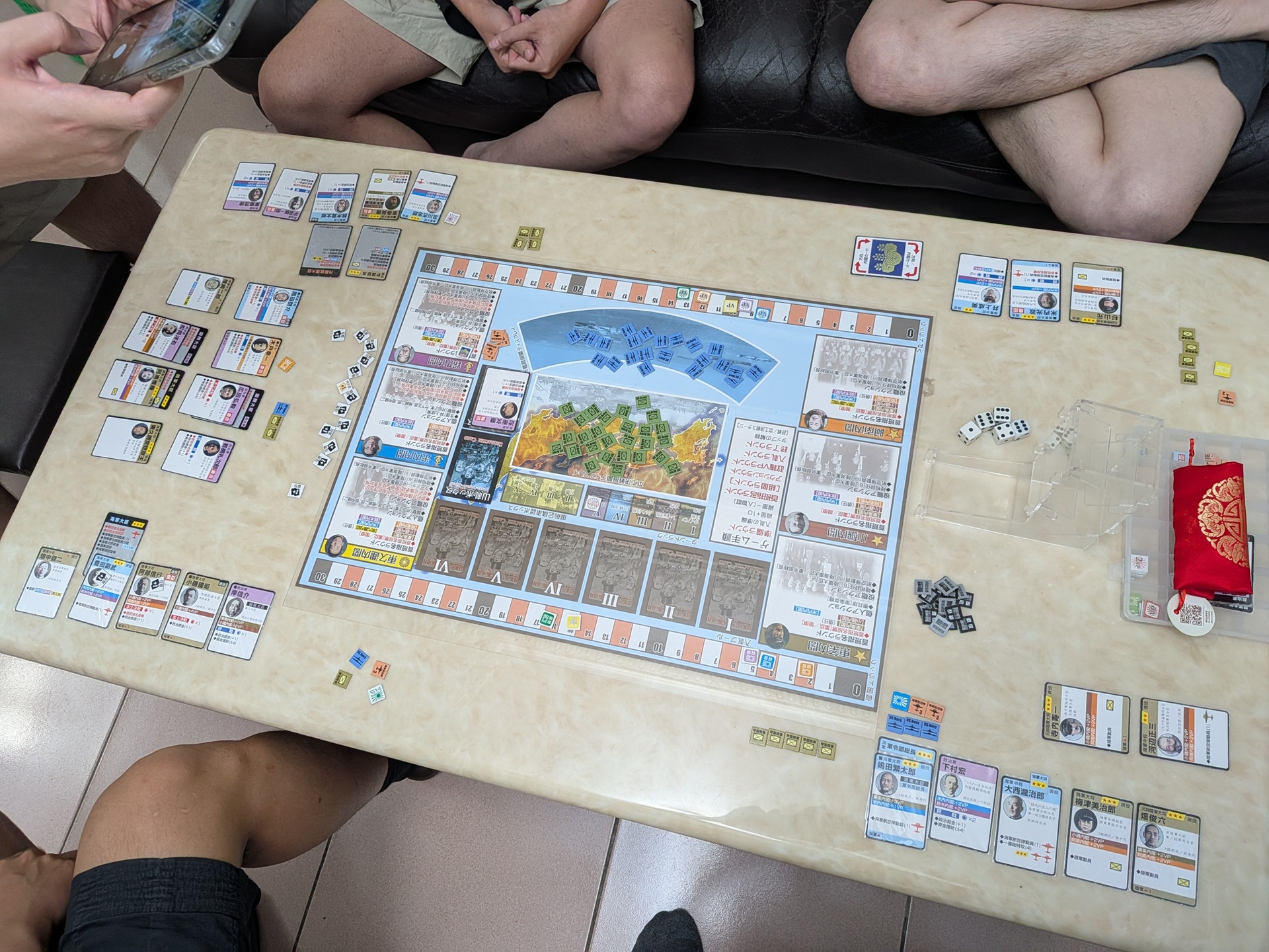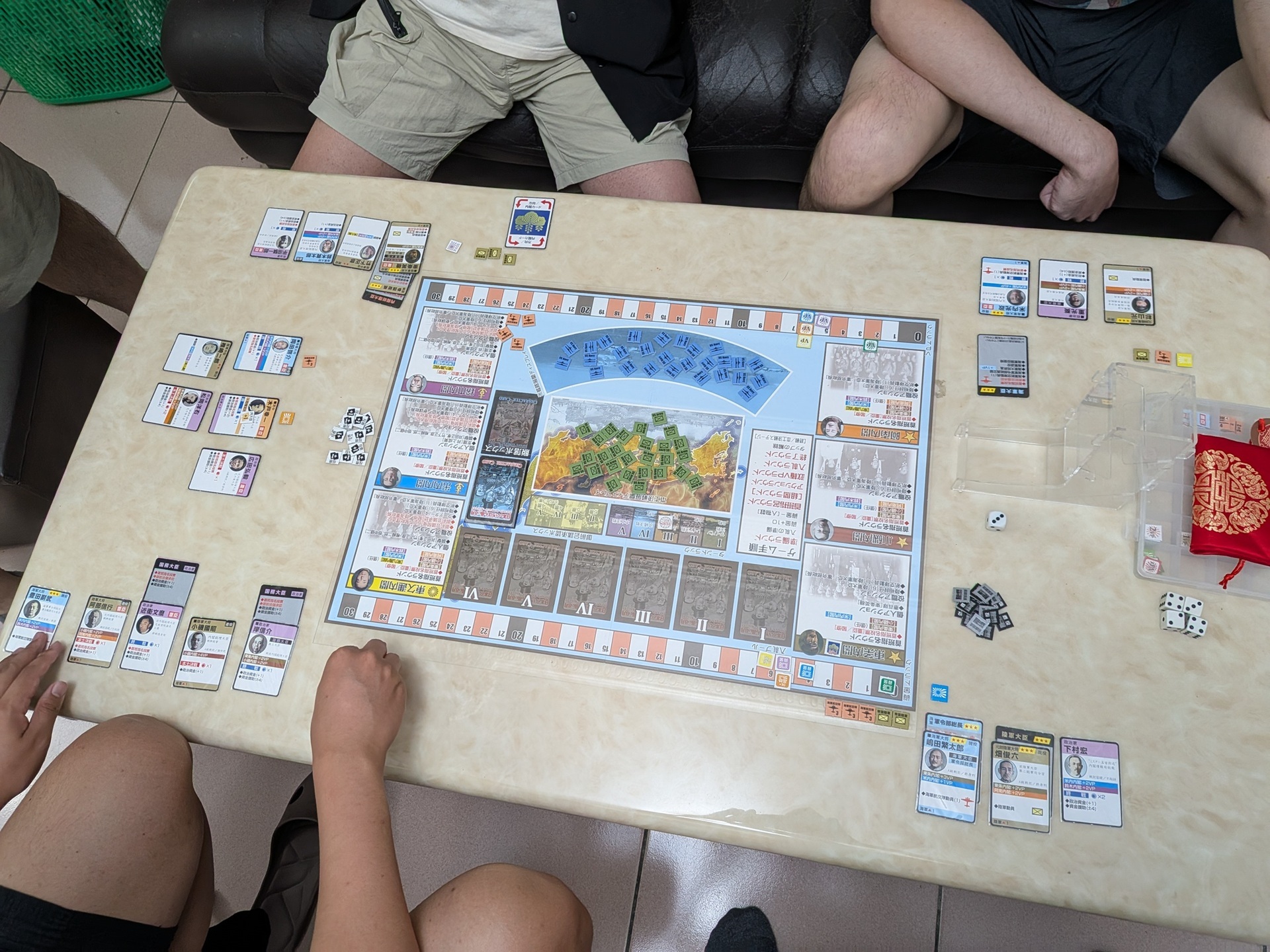 上次對戰拿了太多有投票權的重臣政治家,卻沒有能靠內閣拿分的人物,導致後半雖然能投最多票、爭取官職,卻沒辦法讓我的投票能力轉為得分。這場決定改變策略:不去拿無法得分的重臣政治家,想說這樣不論哪個內閣當選,我都能夠得分,豈不是立於不敗之地?……但這個想法實在是膚淺了。前兩回合大家人物還少的時候,我還能靠著官職投票。第三回合後大家人物增加,有投票權的人能爭取與內閣總理大臣合作、得到官職,我一票都沒有,投票時完全沒有話語權。因為我的人物組合明顯是本土決戰路線,最後兩回合橘紫兩家要推動終戰,我是最大的受害者。但因為我沒得投票,只能眼睜睜看著這兩家通過御前會議,而無法與其他本土決戰較有利的玩家,選出陸軍內閣制止御前會議。在路線的選擇上,感覺前期還是要平衡一些。陸海軍與政治家都要有,才能適當的投票並爭取官職,讓局面往自己有利的方向前進。
