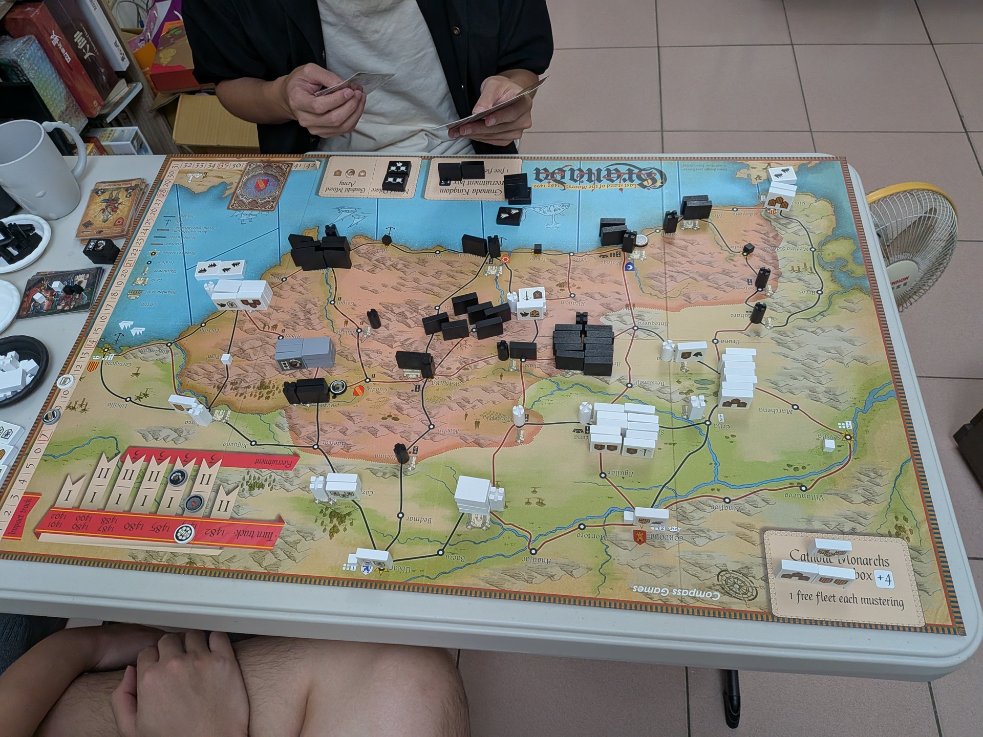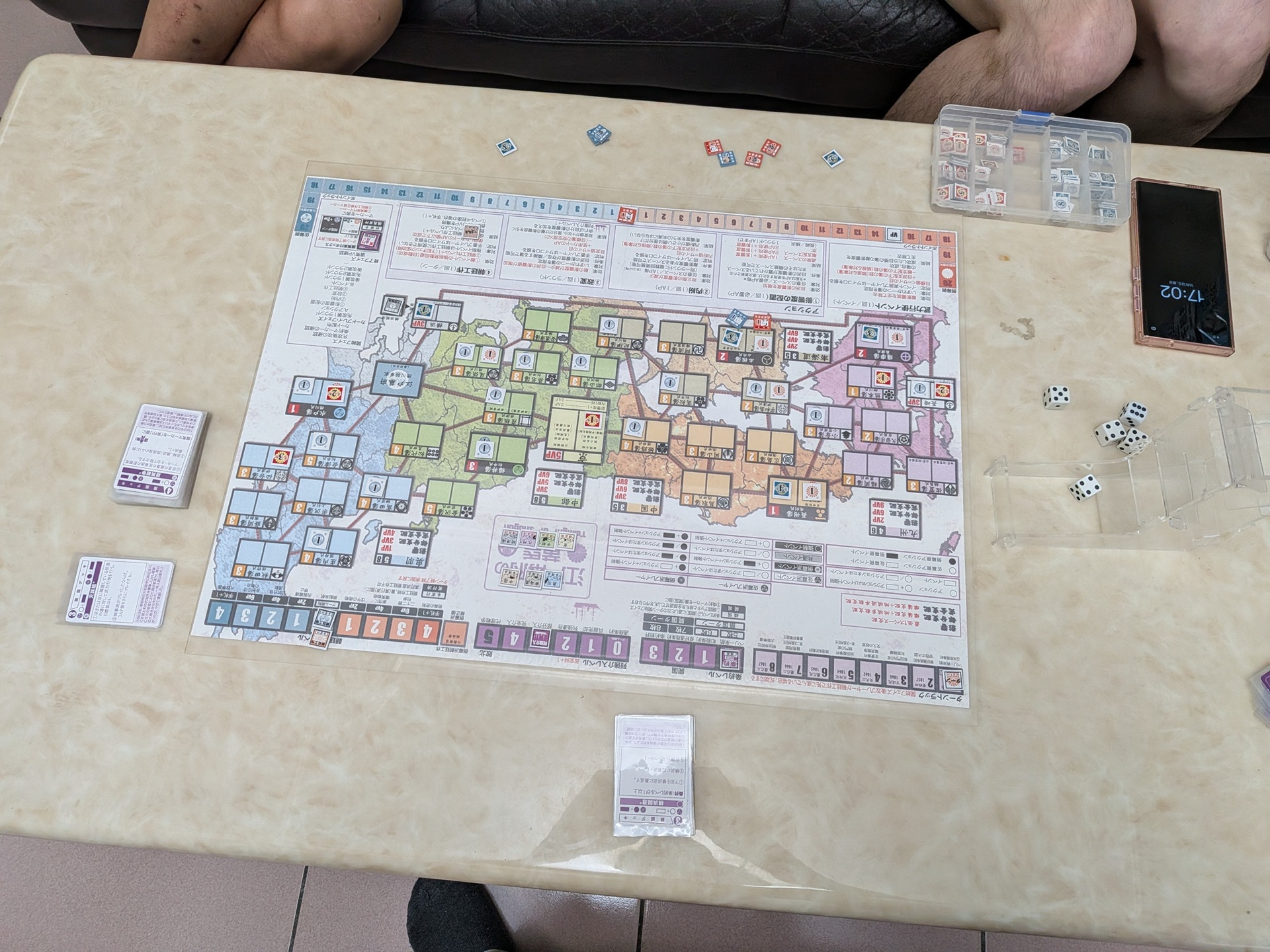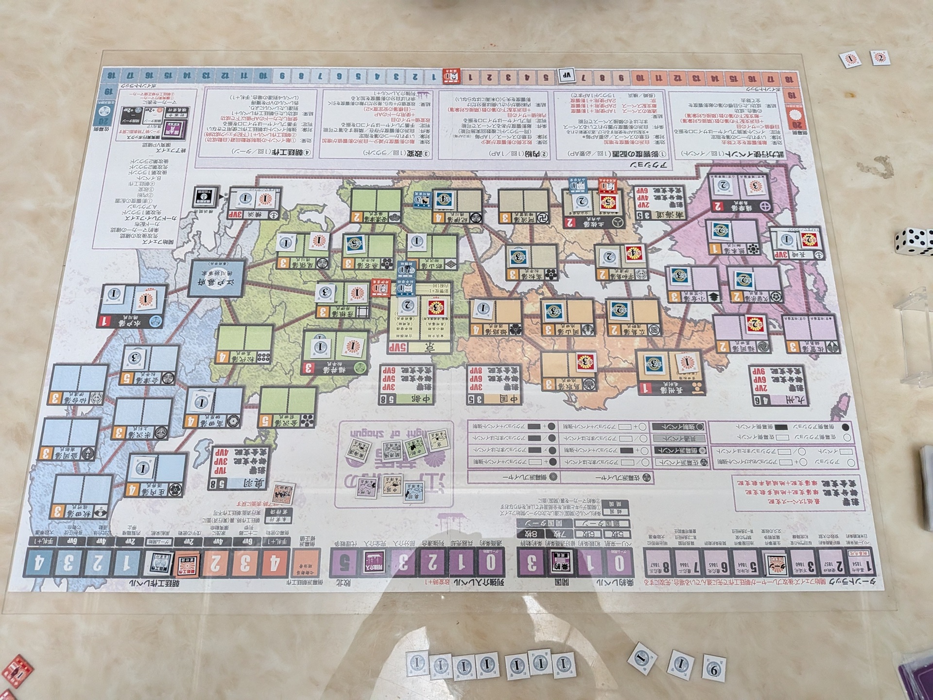 姑且不論開國的事件,在結束的時間點,我和對手都認為現在盤面是佐幕稍微有利——佐幕控制的藩,實在比倒幕多太多,處在內紛擲骰有利的位置。這位對手之前我跟他玩幕末冷戰,幾乎都是被修理的份。但前陣子我收到簡中版,終於可以稍微多研究這款遊戲。之前我們的對戰經驗,覺得宇和島藩與薩摩/土佐兩大雄藩相鄰,是全遊戲最重要的一個藩。但最近我的想法稍微改觀:對佐幕而言,長州始終是最重要的藩,太多開國的強事件,是要倒幕控制長州才能發動。前期佐幕控制薩摩+土佐兩個雄藩,現在我覺得甚至不如只控制長州一個雄藩。在這個前提下,小倉藩對佐幕的重要性,我覺得甚至比宇和島藩更高。這場用最早日版的規則玩,覺得武力行使還是這樣的效果才適中。新版長州多了松江藩,或許這是還不錯的改動——原版中國只有五個藩,太容易獲得完全支配了。