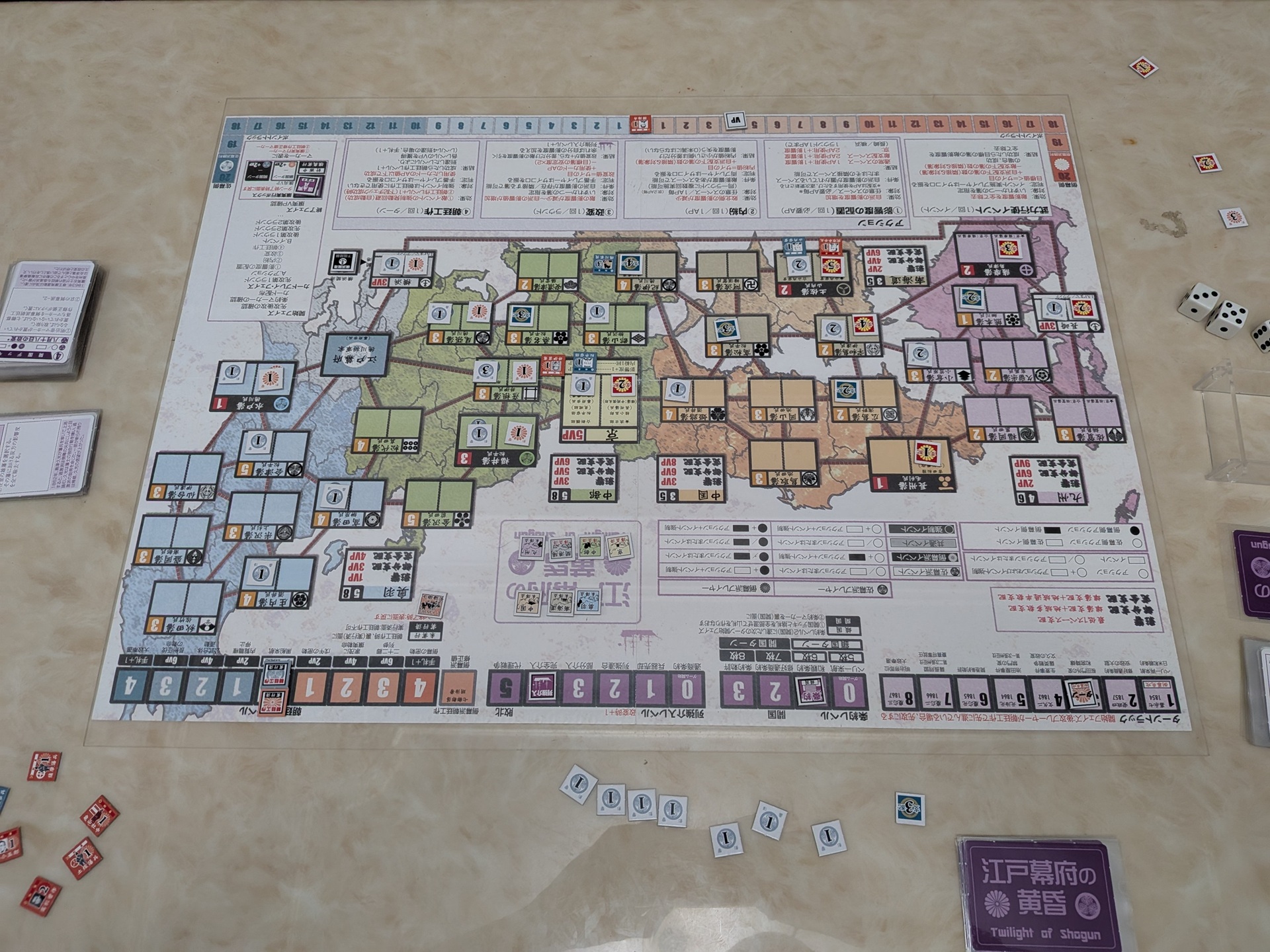 第三回合一開始的盤面。第一回合第一動,倒幕就打出提升條約等級的強制事件。佐幕用山內容堂搶下土佐藩,但倒幕也配置了武市半平太,逐步搶下土佐的控制。佐幕在京都配置了松平容保,倒幕打出井伊直弼出場的事件,但沒多久就出了櫻田門外之變事件,讓井伊直弼退場。此時分數+4VP,京都、中部、九州、港口已計分過一次,倒幕略為領先。