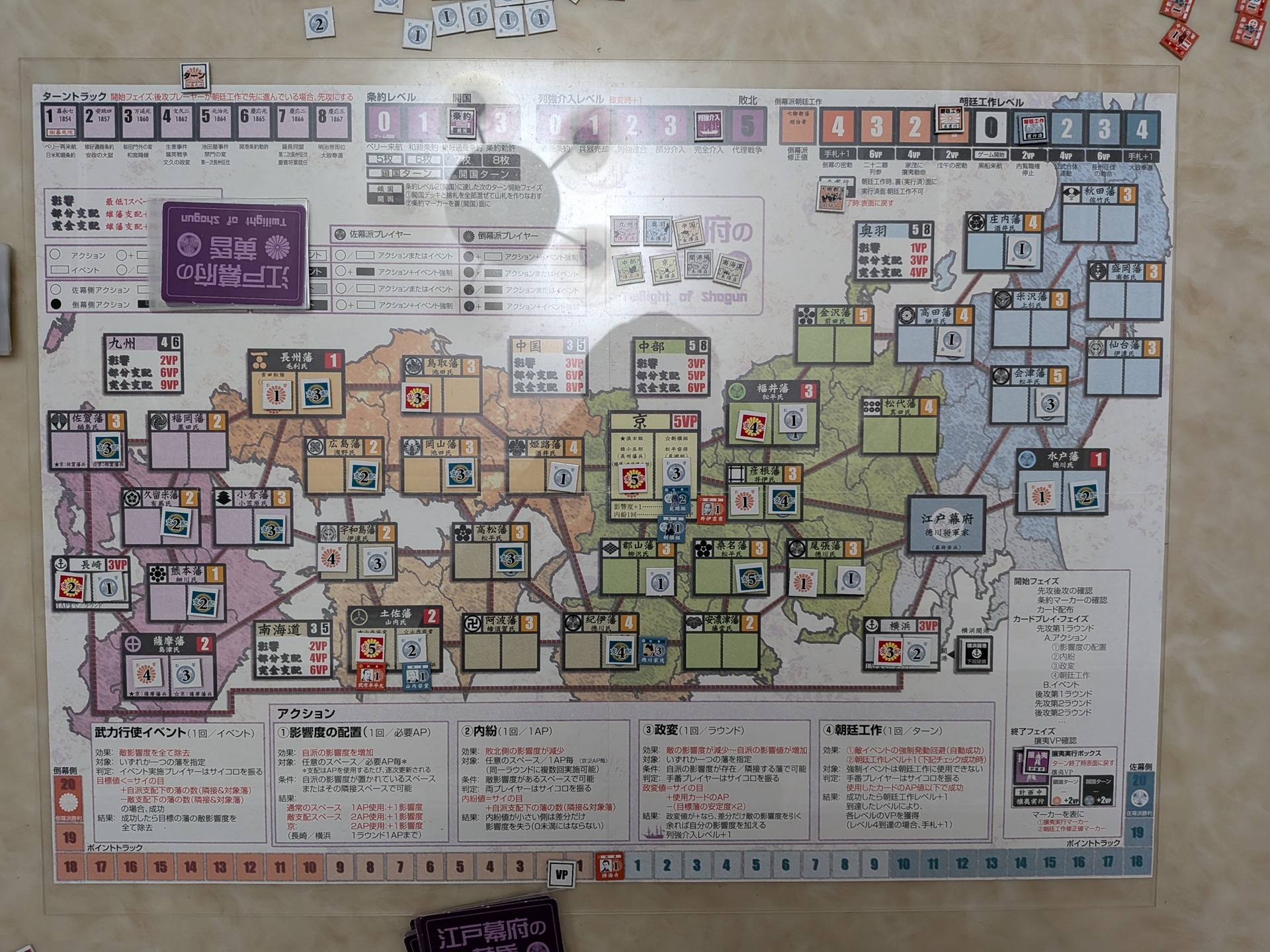 第四回合一開始的盤面。佐幕稍早用四點牌,搶下長州藩的控制。雖然薩摩、土佐兩個雄藩,以及與之相鄰的佐和島藩,都在倒幕的控制之下。但九州與南海道,都是佐幕控制的藩較多。雖然京都是倒幕有利,但佐幕在京都配置了松平容保與新選組,盤面態勢其實是佐幕較好。倒幕一度將分數拉到 10VP以上,但佐幕靠著中國的完全支配,分數拉回到 6VP。第三回合出了第二張提升條約等級的強制事件,第四回合開國。