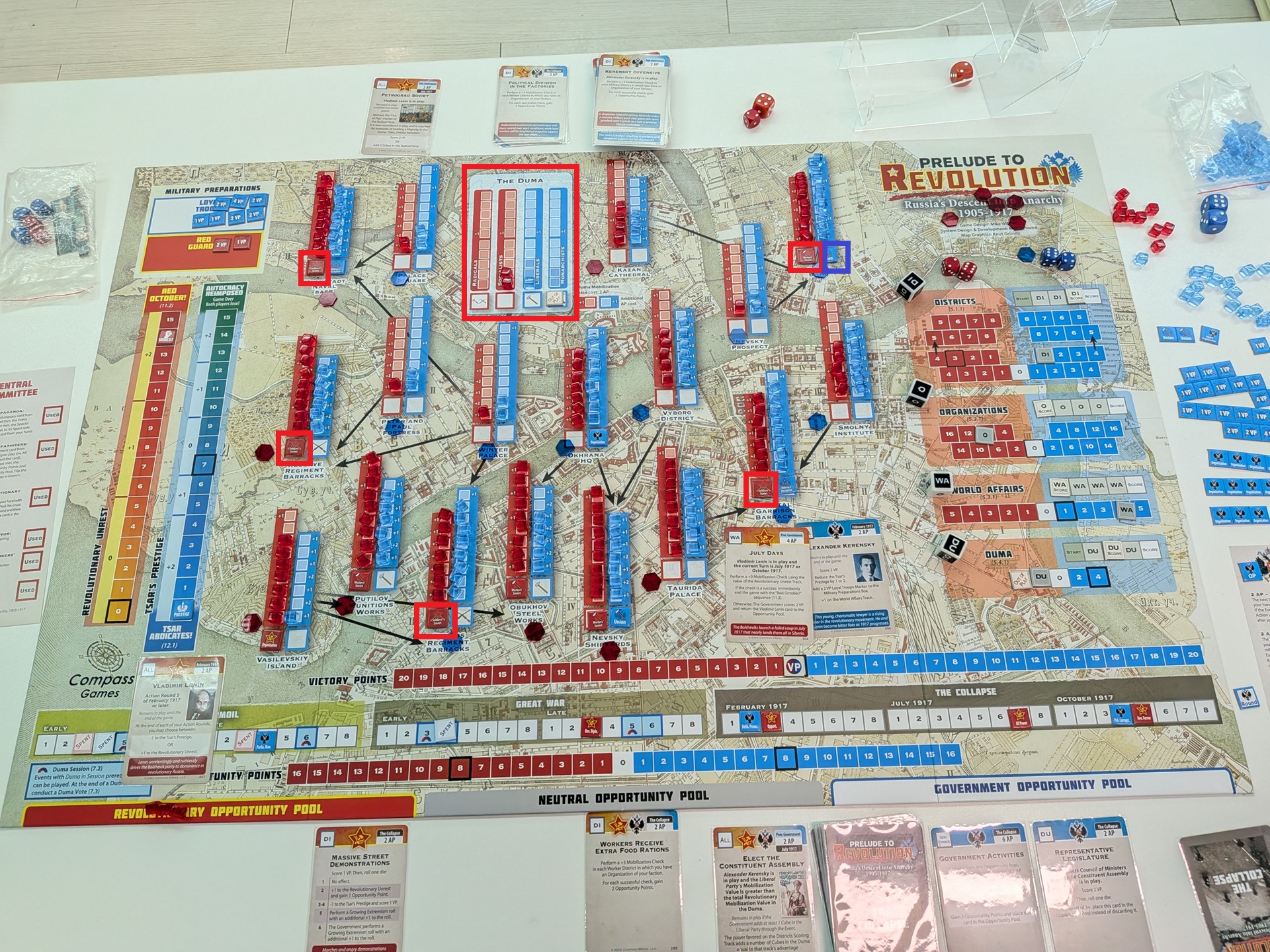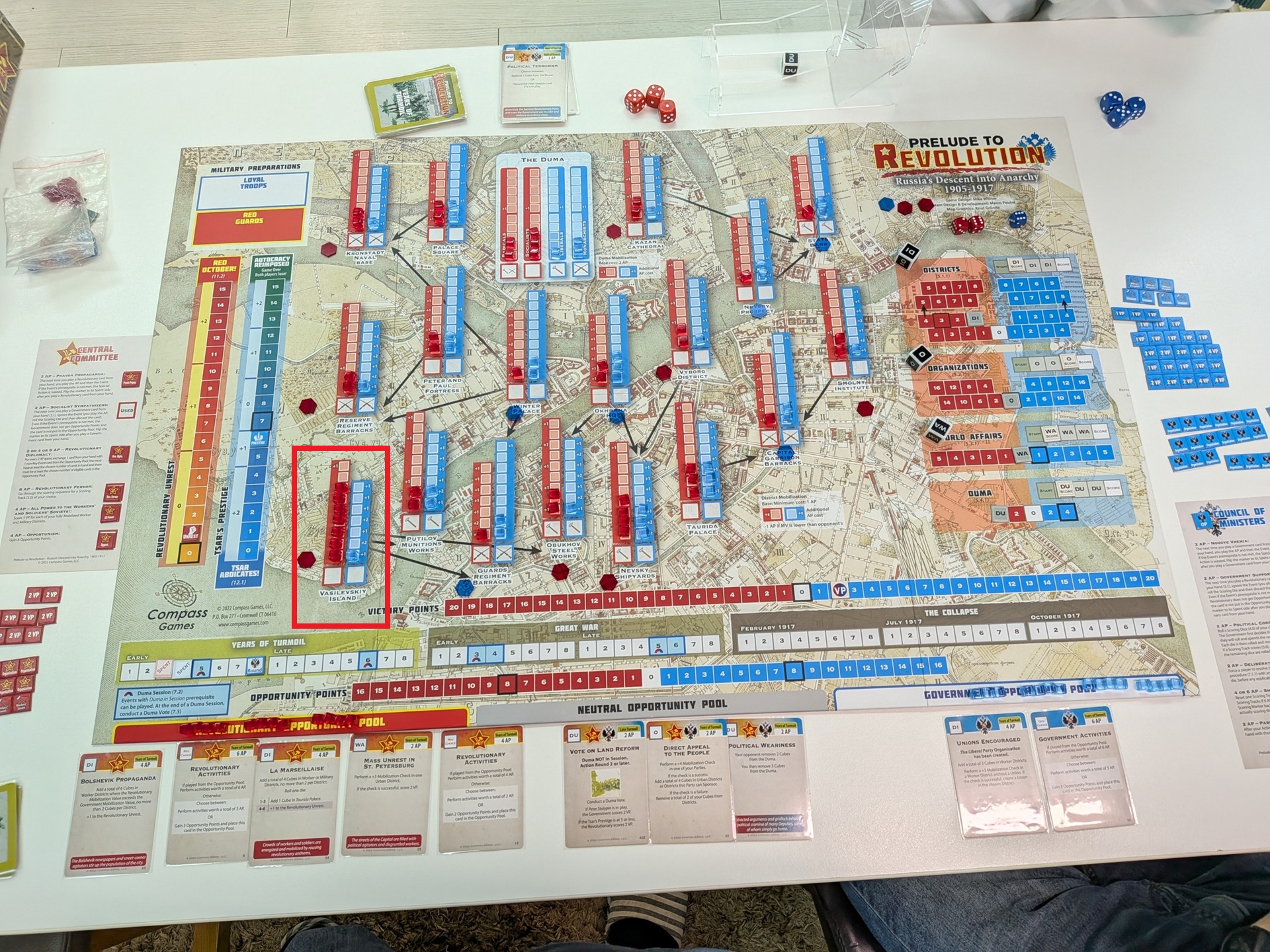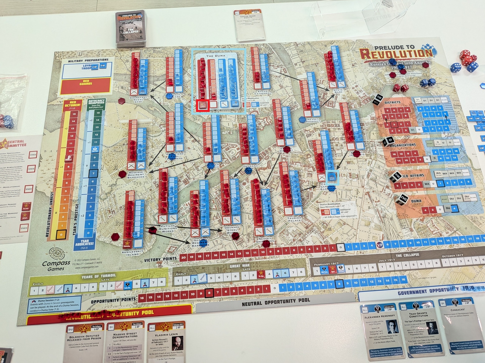 第四回合一開始的盤面。政府方打出了持續性的關鍵事件「WAR!」,刷分同時賺沙皇威望。共黨方扼腕嘆息——因為共黨手上有可以提前禁止「WAR!」打出的事件,但卻沒看清楚事件效果,先當成點數打掉了。共黨在瓦希里島建立組織,政府則在杜馬的激進派建立組織。