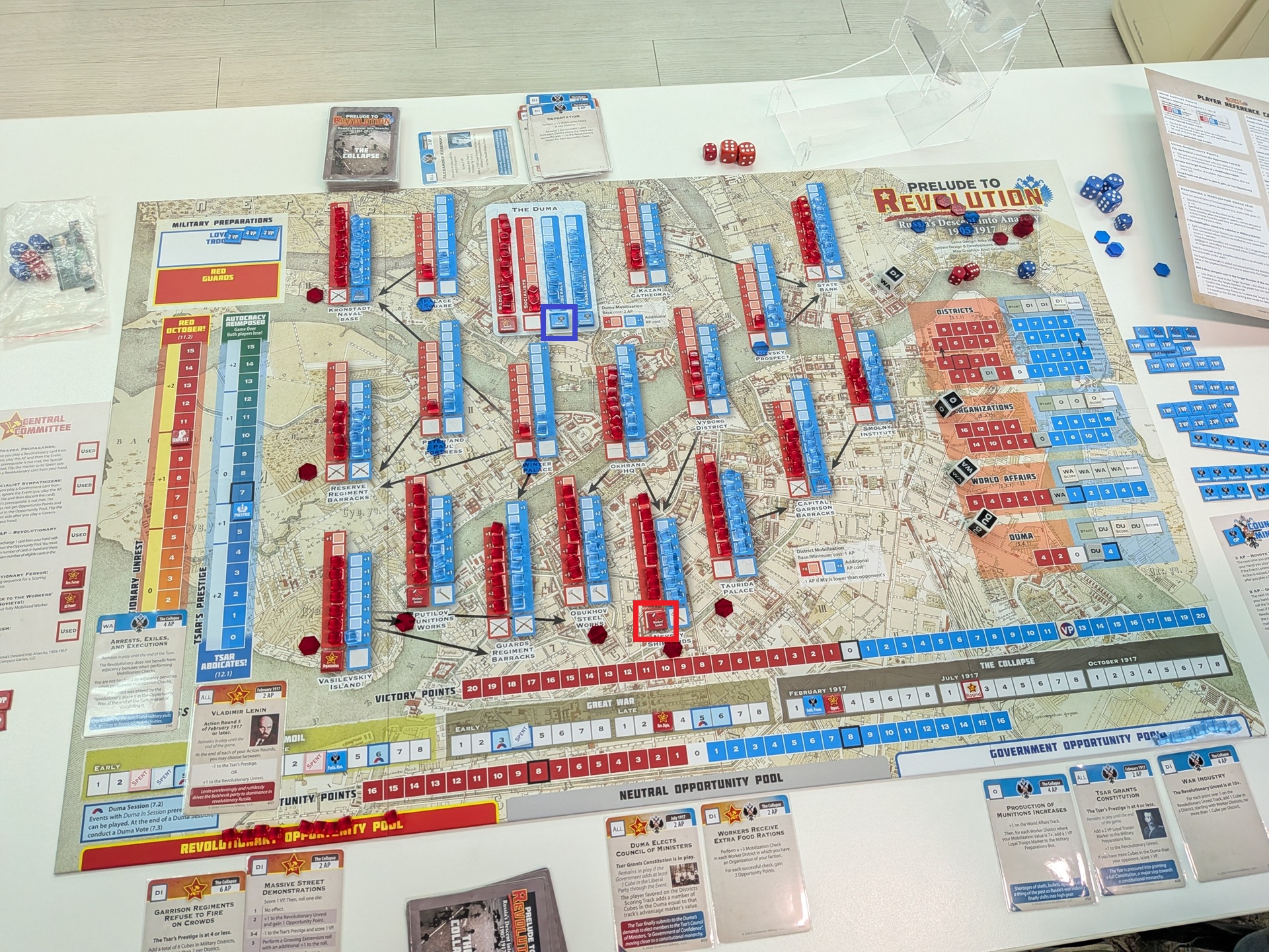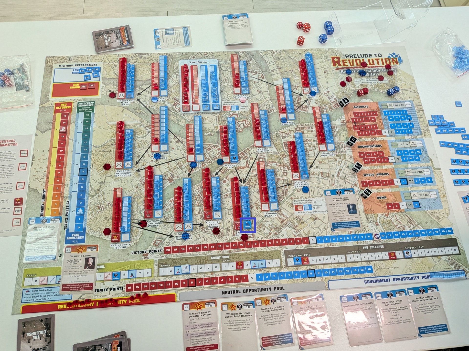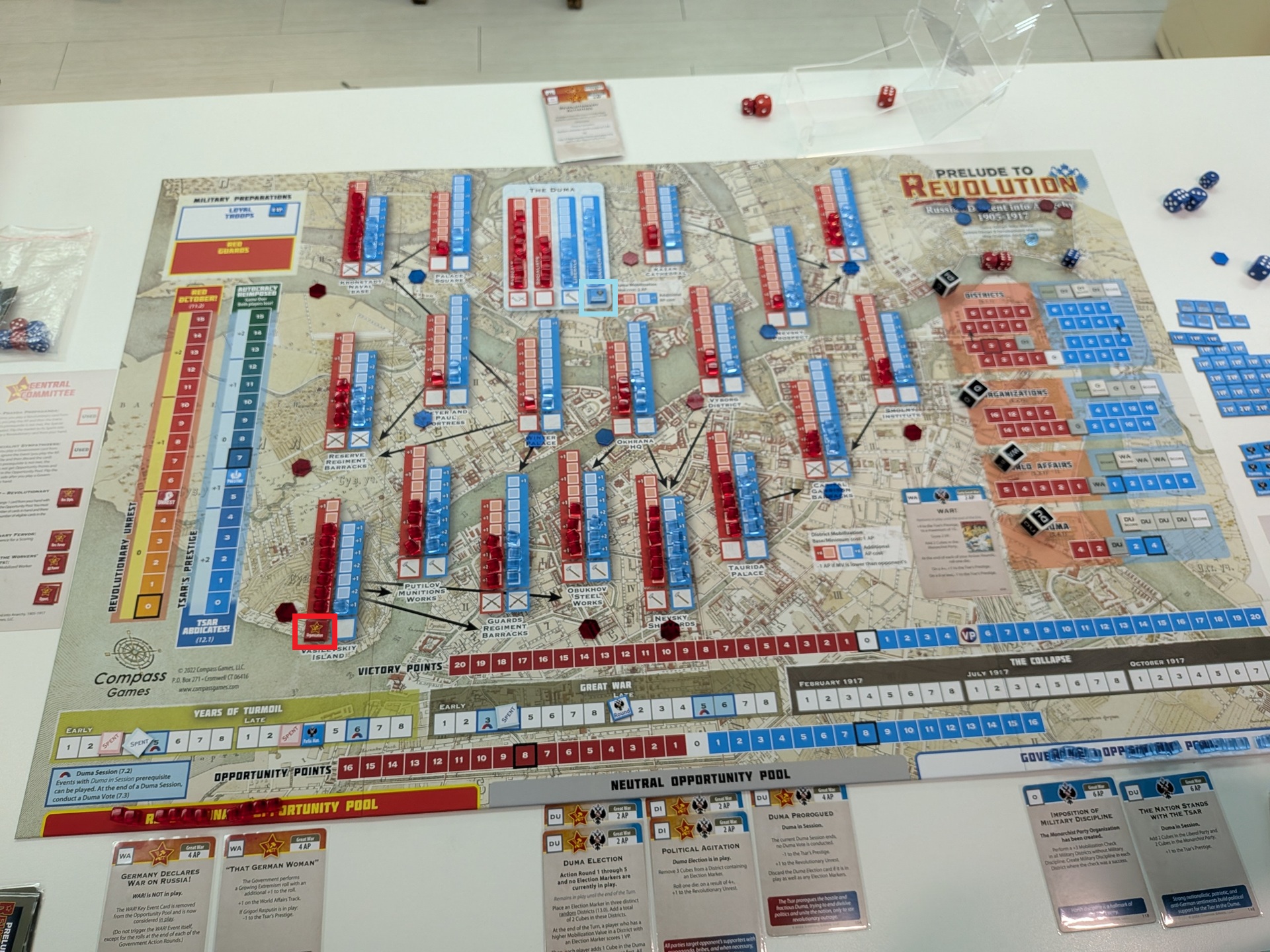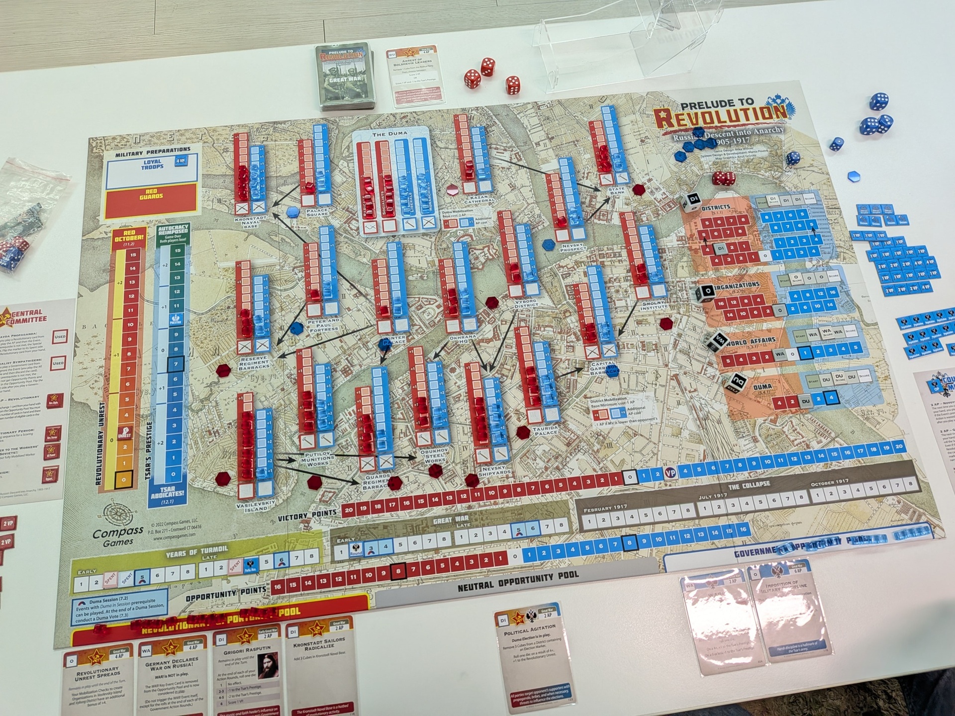 第四回合一開始的盤面。政府方打出了持續性的關鍵事件「WAR!」,刷分同時賺沙皇威望。共黨方扼腕嘆息——因為共黨手上有可以提前禁止「WAR!」打出的事件,但卻沒看清楚事件效果,先當成點數打掉了。共黨在瓦希里島建立組織,政府則在杜馬的激進派建立組織。