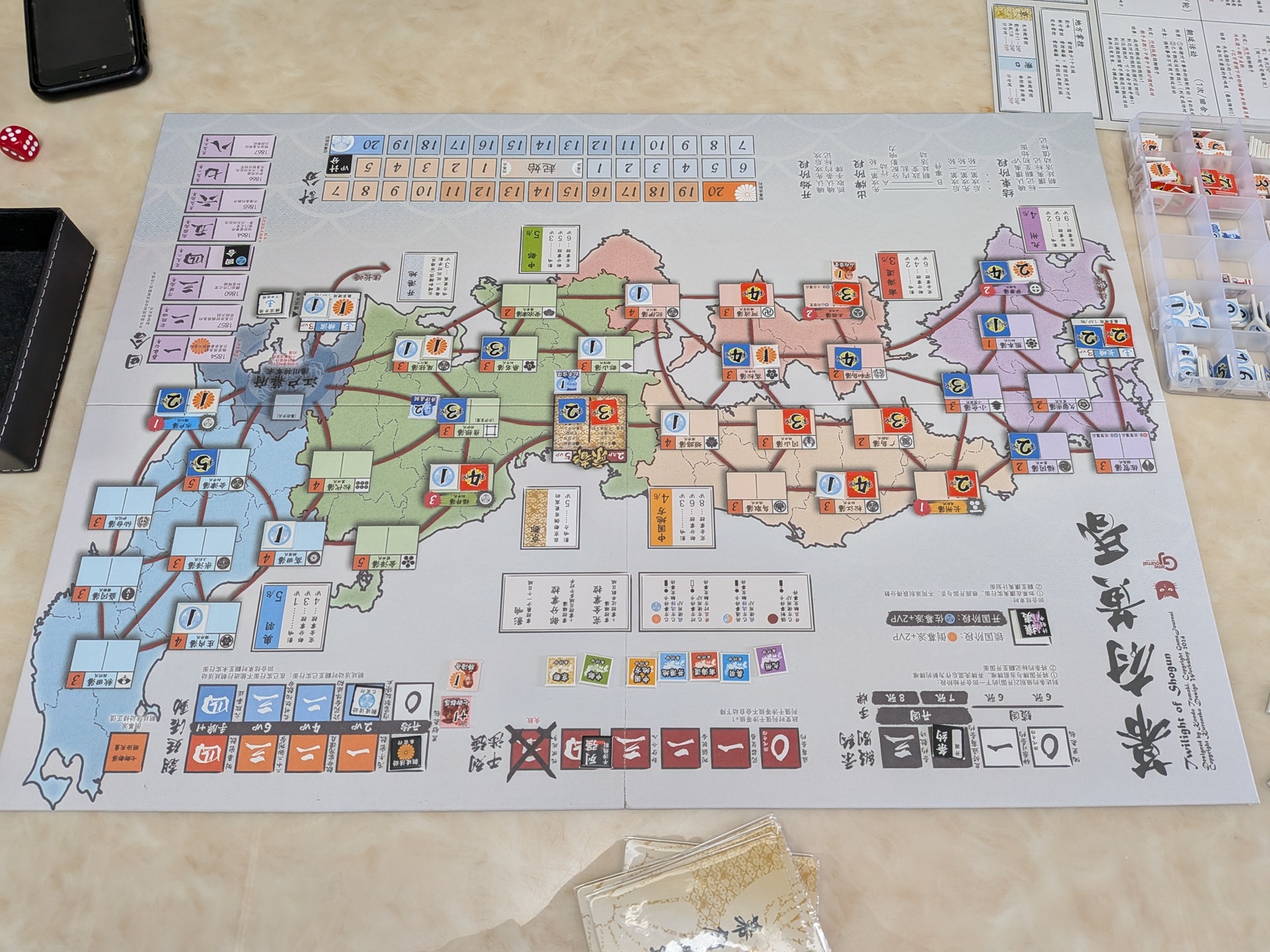 第七回合開始一會的盤面。倒幕第三回合有抽到「櫻田門外之變」,但沒有執行事件、井伊直弼沒有被殺。佐幕因此在中期執行了強力的事件「安政大獄,」並且也靠「鯨海醉侯」,把土佐轉為佐幕控制。此時盤面除了中國地區,都是倒幕有利,分數也因此拉到 –13VP。