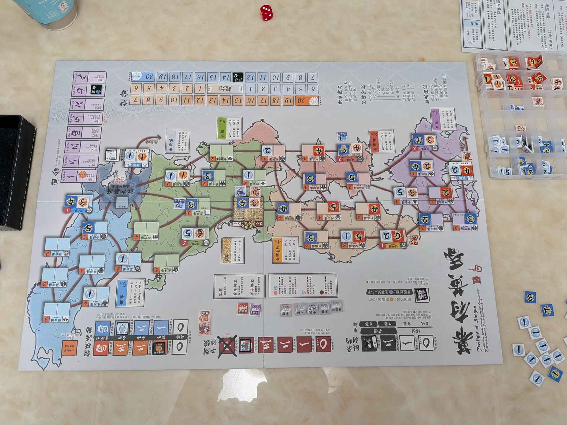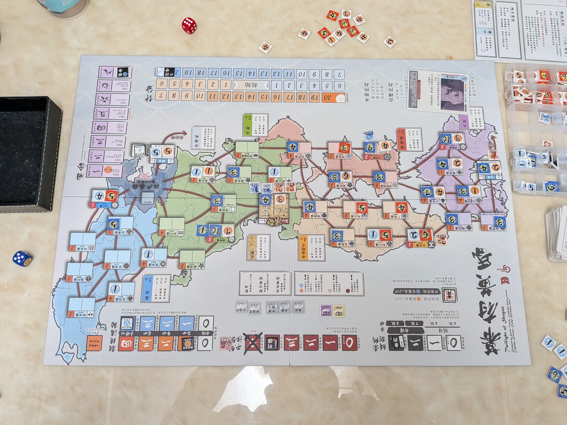 我則是與另一位新手開幕末冷戰。這位玩家之前玩過兩場,都是扮演倒幕方,這場他還是玩倒幕。註:有採用勝海舟/幕府海軍可選規則,武力行使則採用舊版規則&目標值都+1(比照舊版的事件效果)。