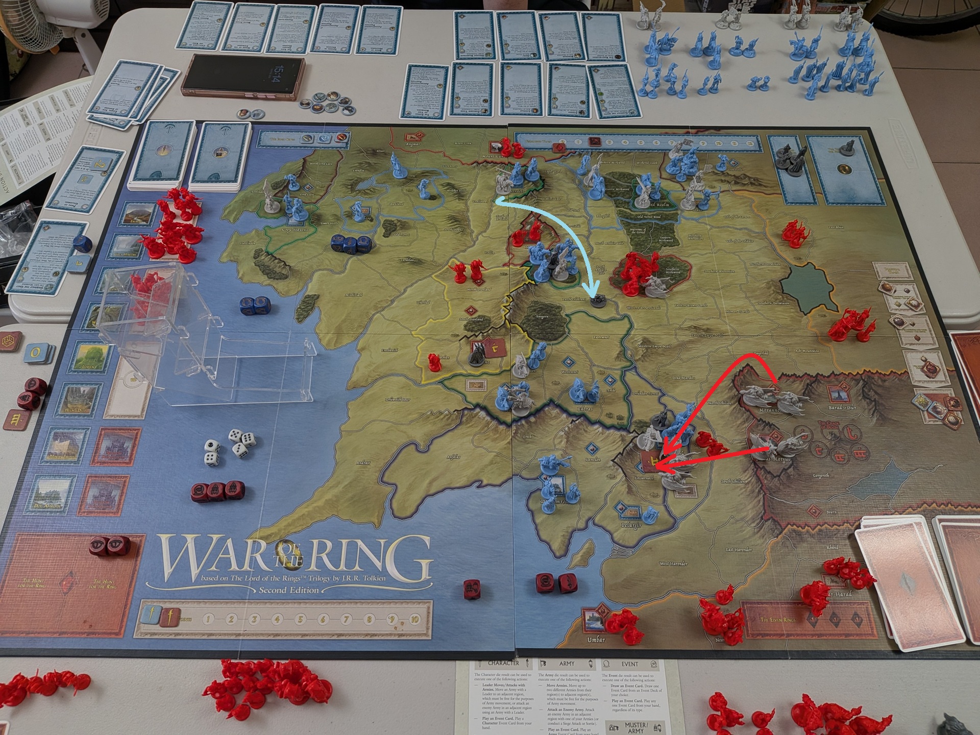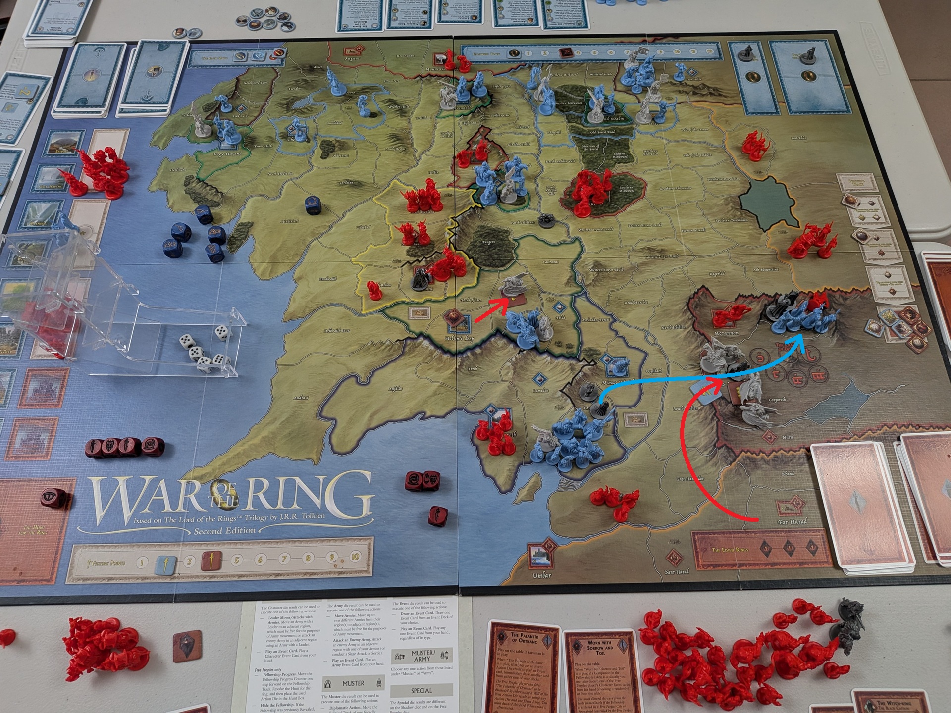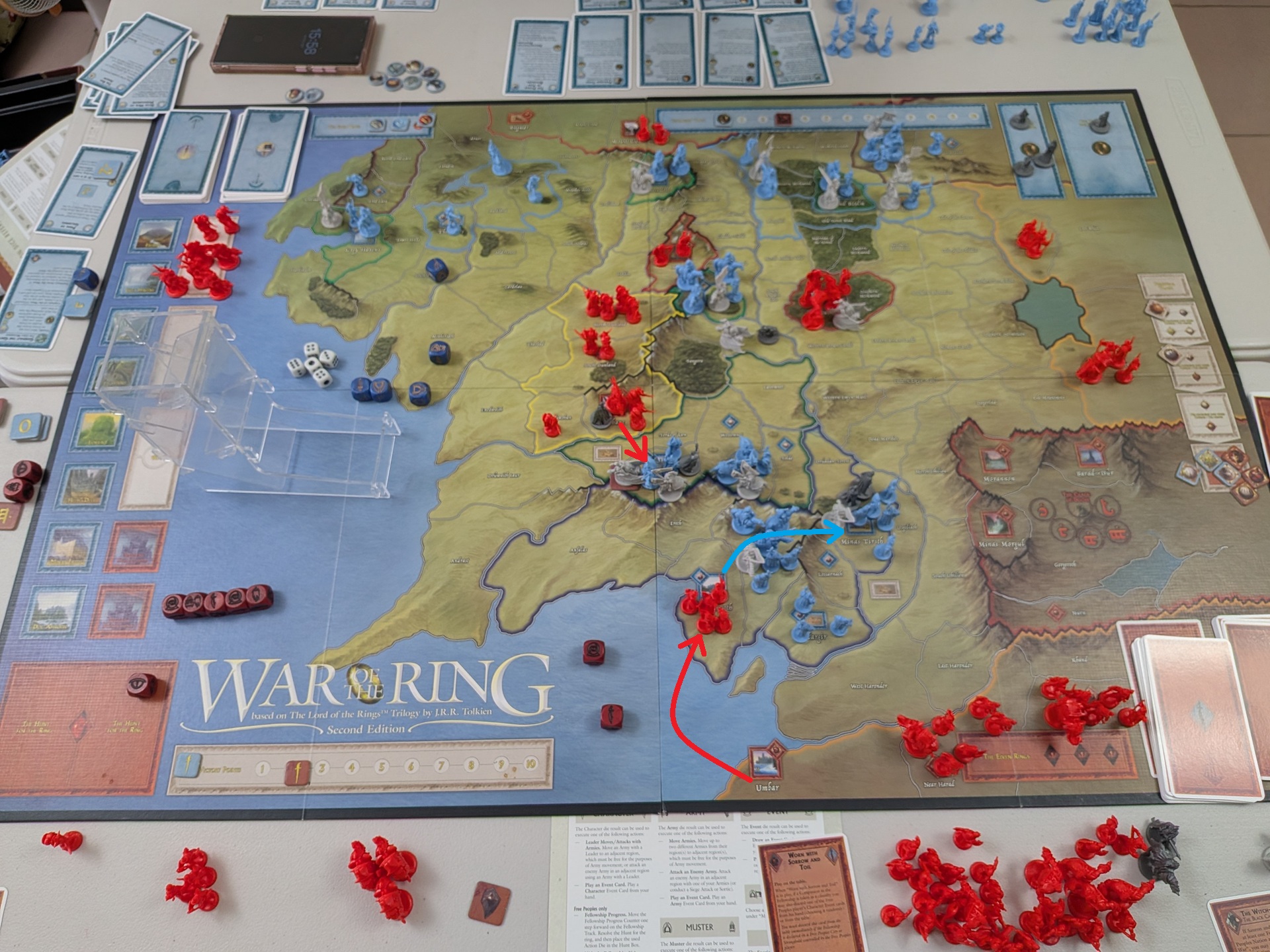 遊戲結束時的盤面。眼見剛鐸部隊進逼魔多,黑暗方一邊在魔多生兵防守,一邊南蠻部隊調往魔多。但剛鐸部隊較近,先攻下了魔多東側的要塞,隨後留下一半部隊防守,剩下部隊繼續進攻魔多北側的要塞。南蠻部隊雖然已經反攻回魔多東側的要塞,但無法全滅守城部隊、搶回要塞控制。剛鐸部隊於是又攻下了魔多北側的要塞,獲得 4VP立即勝利!